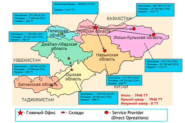 В компании хорошо организована система логистики, которая включает головной офис в Бишкеке с основным складом и соответствующие склады в регионах: